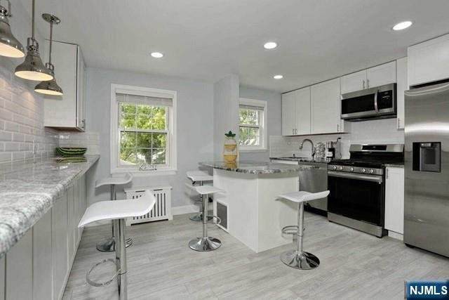 Gorgeous fully renovated condo with 2 parking spaces - a garage with an automatic door opener & outdoor condo parking in the best East Hill area of Englewood, located on the picturesque grounds with manicured lawns on a quiet side street in the heart of Downtown Shopping & Restaurant District! 10 min drive to NYC! NYC express bus & local buses out front. Stunning sun drenched modern fully renovated 2 bedroom unit with 5.5 feet height attic above the entire unit for storage; new electric panel, new state of art eat-in open concept windowed kitchen with oversized breakfast bar, island, granite countertops, & stainless steel appliances. New gorgeous windowed bathroom, new floors, large windows, 6 huge closets, modern electric fireplace, recessed lighting. Ample free street parking. New laundry facility on premises. Walk to the library, Bergen Performing Arts Center, yoga & hot yoga, Shoprite, Englewood Hospital, parks, Houses of Worship, & all restaurants imaginable! Garden style building with benches outside. Cats friendly. Only therapy dogs for the tenants, dogs allowed only for the owners residents. Amazing very responsive management company keeps the entire building & its grounds in perfect condition. Superintendent on premises. Great community! Relative has NJRE.