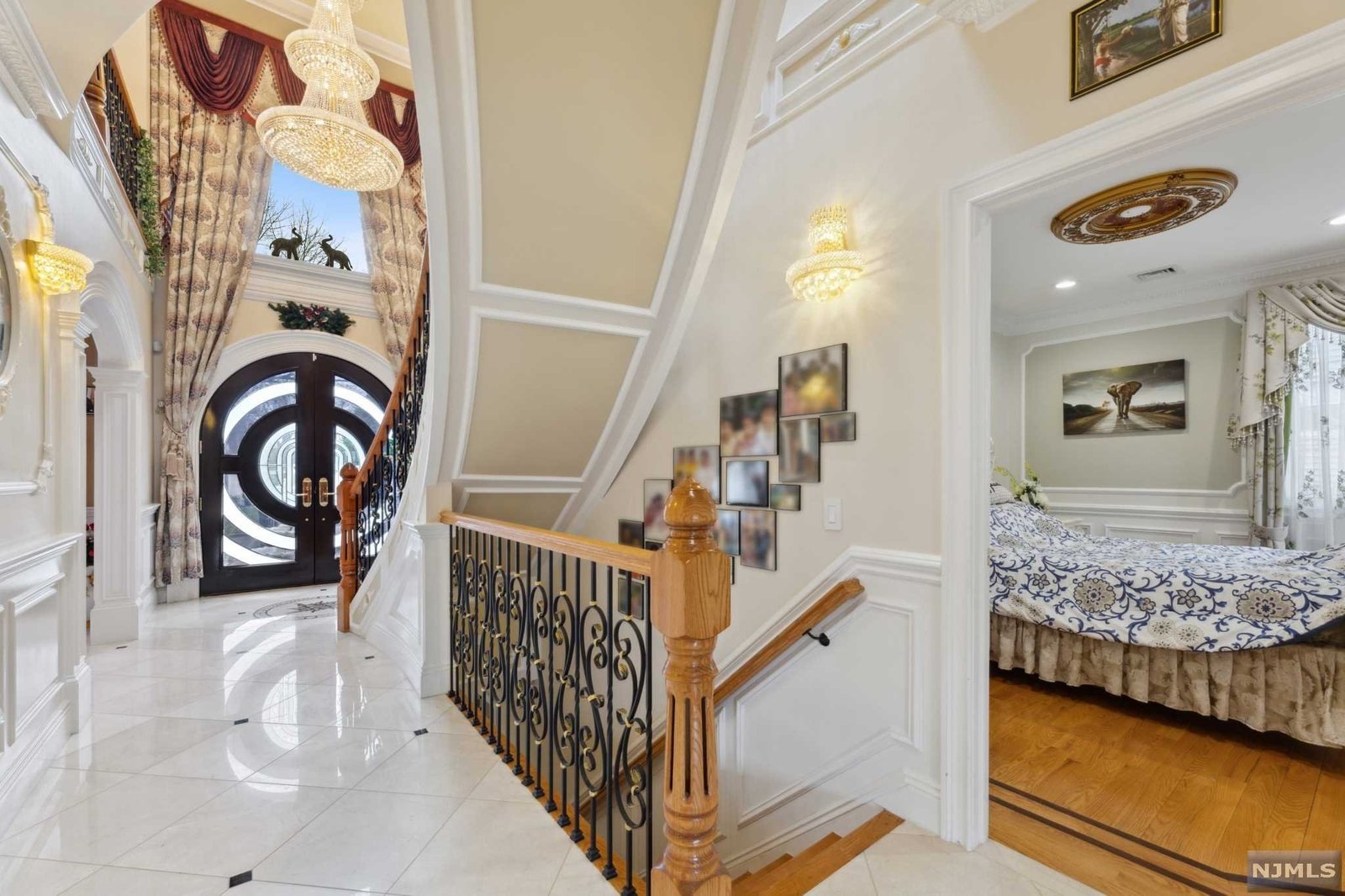 Palatial young custom Colonial home in Paramus boasts 7 bedrooms, 6 and 1/2 bathrooms, and an attached two-car garage just nineteen miles northwest of Times Square.this home features an astounding volume of space with modern luxury finishes, marble and porcelain tile throughout, and multiple spaces for entertaining. The comfortable open flow takes you to the spectacular gourmet kitchen with an adjacent family room with an intricate corner gas fireplace leading you to the large deck. Completing the main level is a powder room, garage access, and a bedroom with inlaid hardwood floors, and a suite like bathroom. The second floor features beautiful inlaid hardwood floors in all four bedrooms. The luxurious primary bedroom suite has a gorgeous coffered ceiling, walk-in closet, private balcony, and a spa-like bathroom, 3 additional bedrooms all include suite like bathrooms! Come see this magnificent home is ideally located in a community know for low taxes.