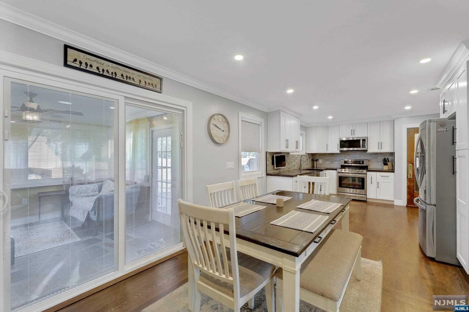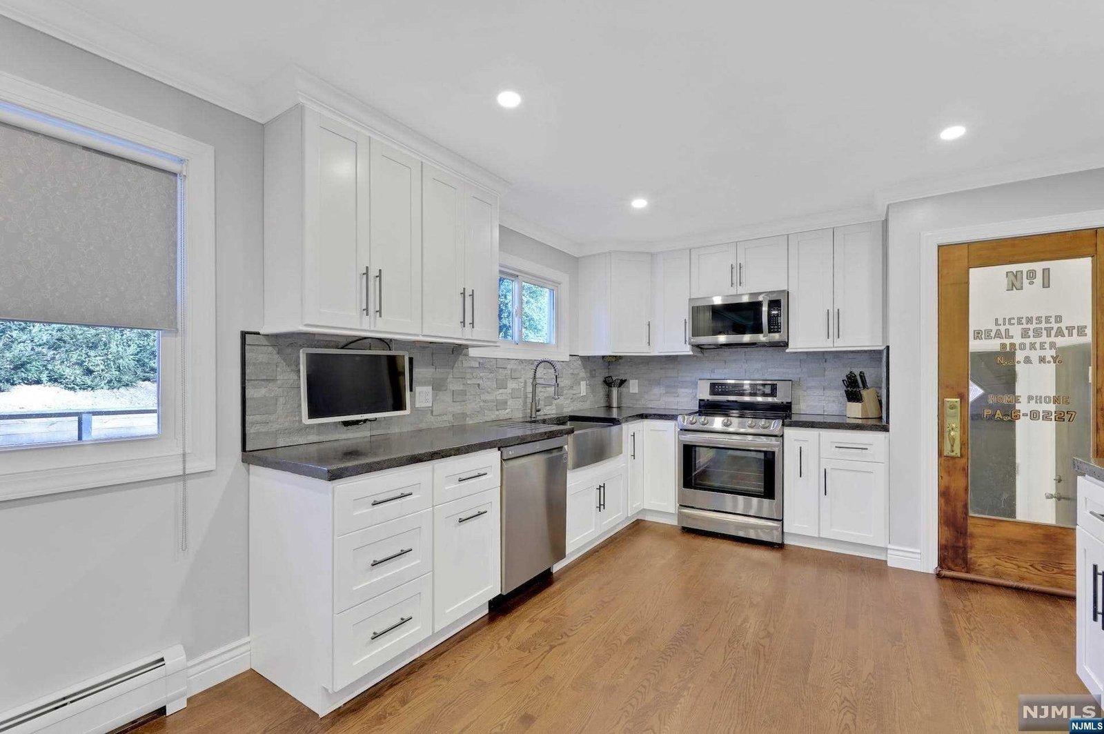 Welcome to this modern and beautifully updated 2-bedroom, 1.5-bath ranch, blending style and comfort with the ease of one floor living. Extensive renovations include: new siding, front windows, c/a, 2 zone baseboard heat, new and newly re-finished wood floors; modern eat-in kitchen with stainless steel appliances, new full bath w/radiant heat and new half bath in primary bedroom; LR w/crown molding, newly re-finished wood floor and wood burning fireplace. Enter hallway through French door to two bedrooms and luxurious full bath. Primary bedroom has two double closets and half bath, second bedroom w/large closet. New sliding doors lead to 3 season room w/wood burning stove, overlooking picturesque property with access to new deck and delightful outdoor fireplace. Steps away you will find the tranquility of the reservoir, nearby parks and tennis. Walk to the highly rated Harrington Park School. Attached one car garage with access to plentiful attic storage. Welcome home!