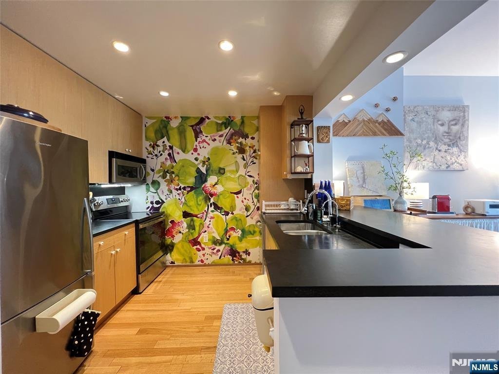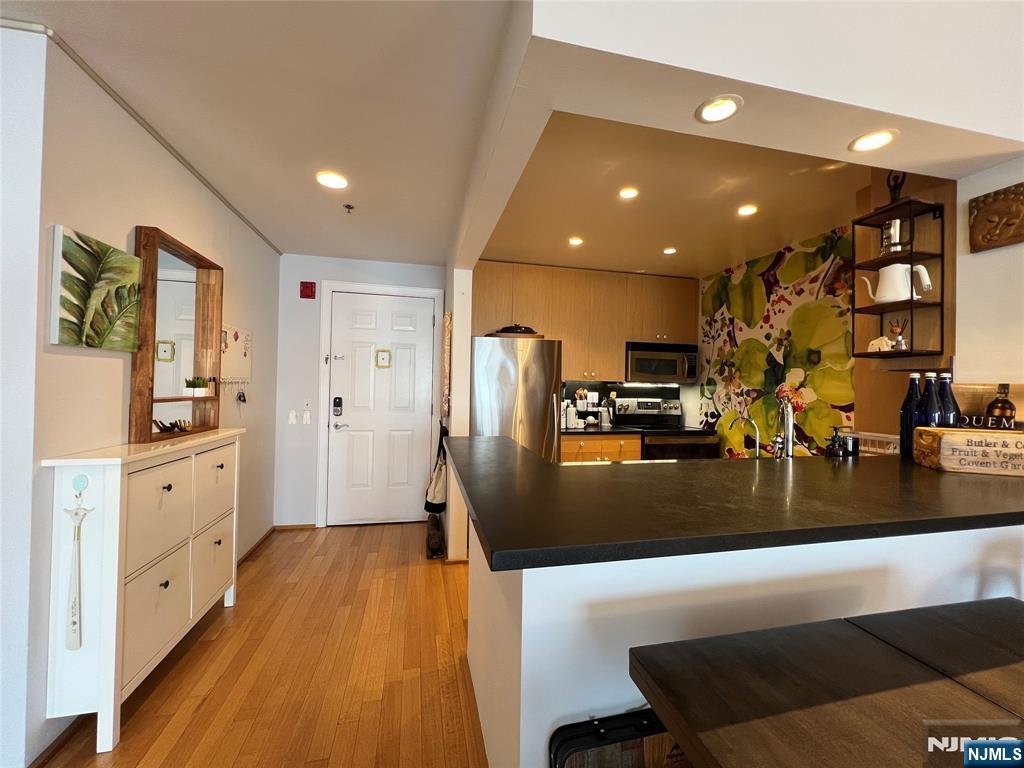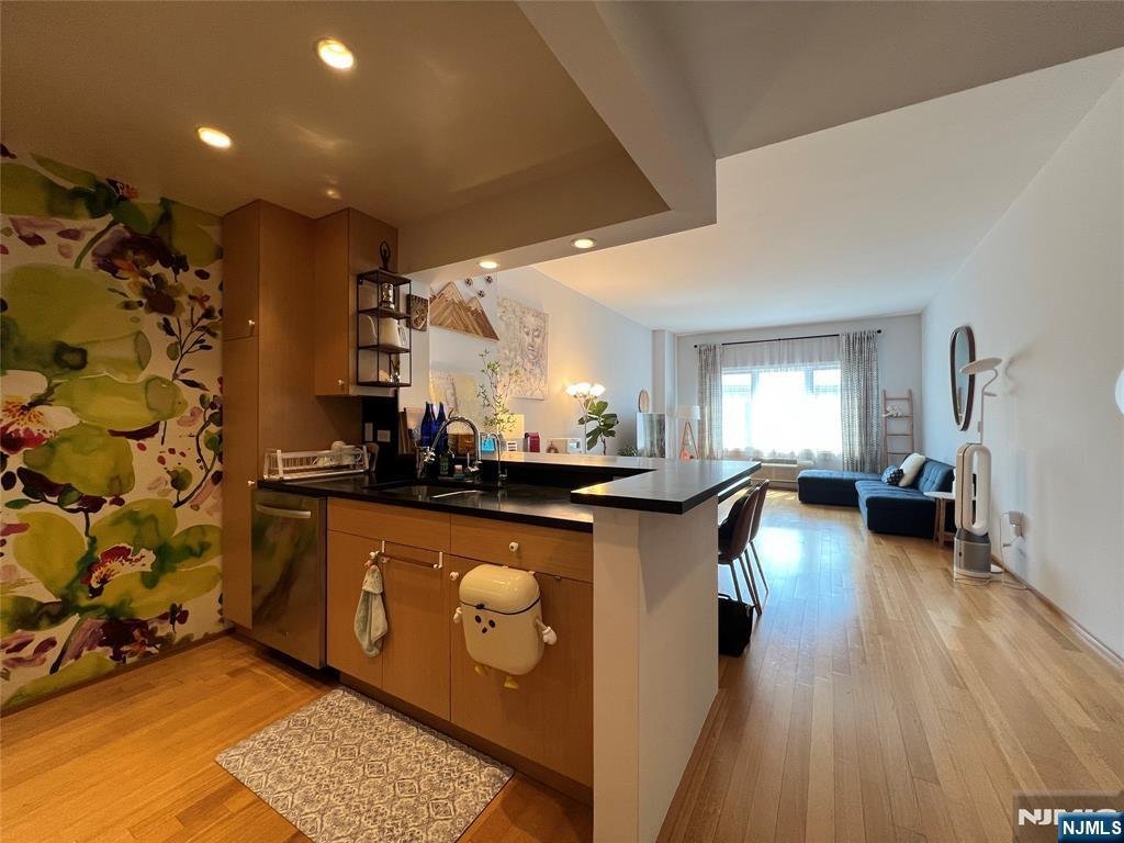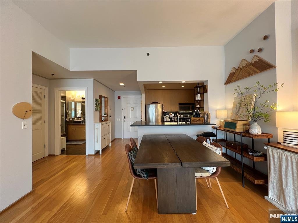 Unit 3513 at The Peninsula Condominium is a bright, southern-exposure 950 sq. ft. 1BR corner unit on the top floor with soaring 10-ft ceilings. The home features hardwood floors throughout, an open kitchen with black granite countertops, wood cabinetry, and stainless steel appliances. The spacious bedroom includes a walk-in closet, and there is an in-unit washer/dryer. The Peninsula offers 24-hour concierge service and complimentary garage parking. Investors are welcome, and the building is pet-friendly (under 30 lbs). Ideally located along the Hudson Riverfront Walkway, with shops, cafes, and restaurants just steps away. Commuting to NYC is easy with NJ Transit buses #156, #158, and #159 right on River Road.
