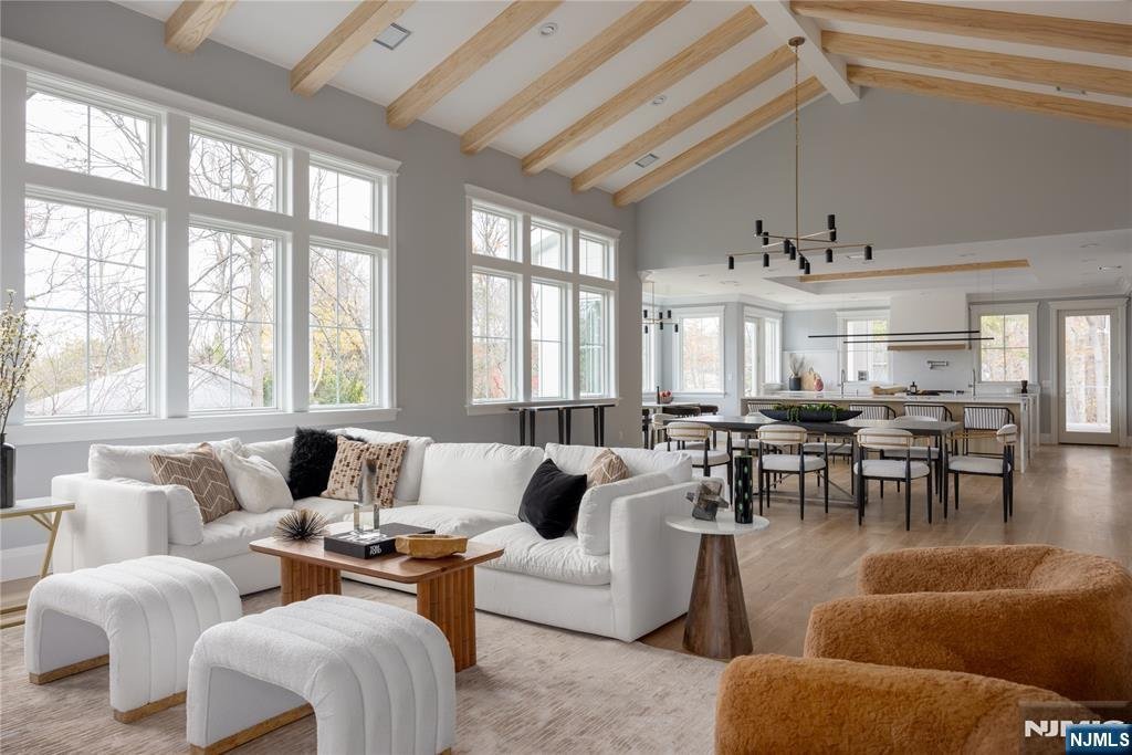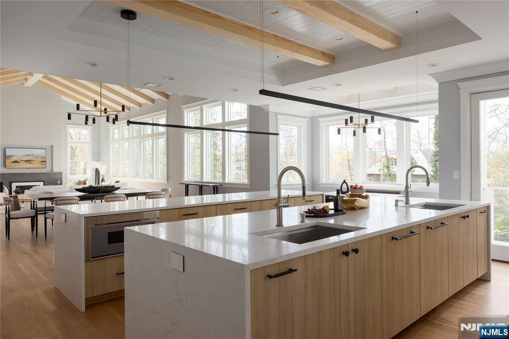 Exceptional new construction mins from NYC, offering approx. 9,600 sq ft of masterfully designed living space across 3 finished levels. Thoughtfully built to balance everyday function w/ luxury living, this home features cathedral ceilings, exposed beams, custom millwork & wide-plank white oak floors throughout. The main level centers around a light-filled open floor plan anchored by a dramatic great room w/ fireplace & 7-ft windows w/ transoms. The dream kosher kitchen stuns w/ dual 12-ft quartz islands, double sinks, double ovens, two integrated refrigerators & a custom walk-in pantry. The adjacent dining area is elevated by a showstopper wet bar. A covered outdoor living room w/ built-in kitchen, fireplace & heaters offers year-round comfort. A private en suite bedroom, formal office & a mudroom complete the main level. The second level features 5 en suite bedrooms, including a palatial primary suite w/ vaulted ceilings, gas fireplace, radiant spa bath, custom walk-in closet w/ center island & private balcony. A large laundry room w/ double washer/dryer units adds convenience. The walk-out lower level offers oversized windows, direct yard access, an en suite bedroom, half bath, multiple recreation spaces & a lounge bar w/ island seating. The 3-car garage features 12-ft ceilings ideal for lifts & two EV charger locations. Finished in Hardie board & stone w/ Pella windows, smart home systems & whole house generator, this property is designed for how you truly live.