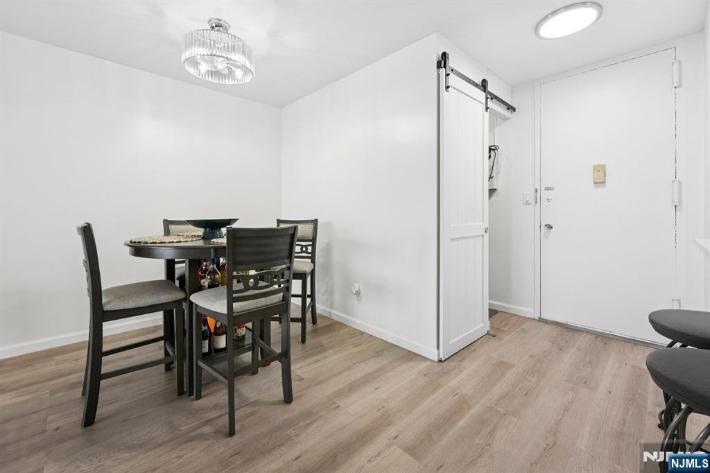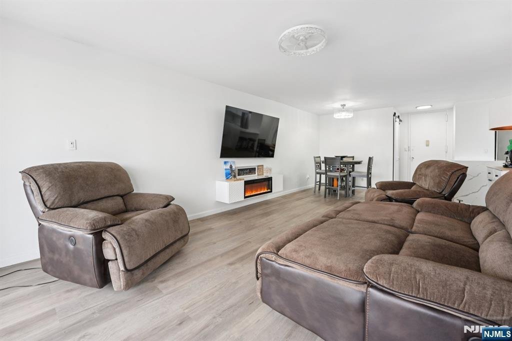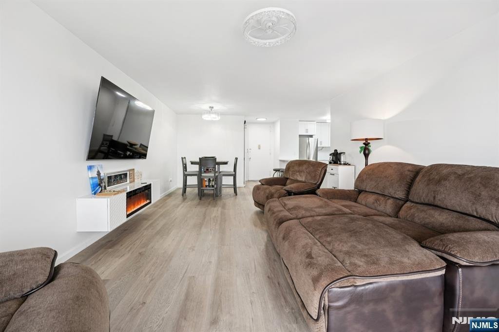 MOVE right in to this totally renovated 2-bedroom apartment. The modern, sleek, white open kitchen with an island is a showpiece. BRAND NEW WHITE MODERN hall full bathroom, bedroom, and primary bedroom ensuite with a modern bathroom featuring a spacious linen closet. New plank floors, smooth ceilings, balcony, and large entrance closet. Parking is $60.00 per month for the garage; the building is wired for SPECTRUM OR FIOS. NJ transit bus 158 at the door. Co-op approval required...30% down, then 4 to 1 ratio. CASH-2.75 to 1. JUST BRING YOUR TOOTHBRUSH.