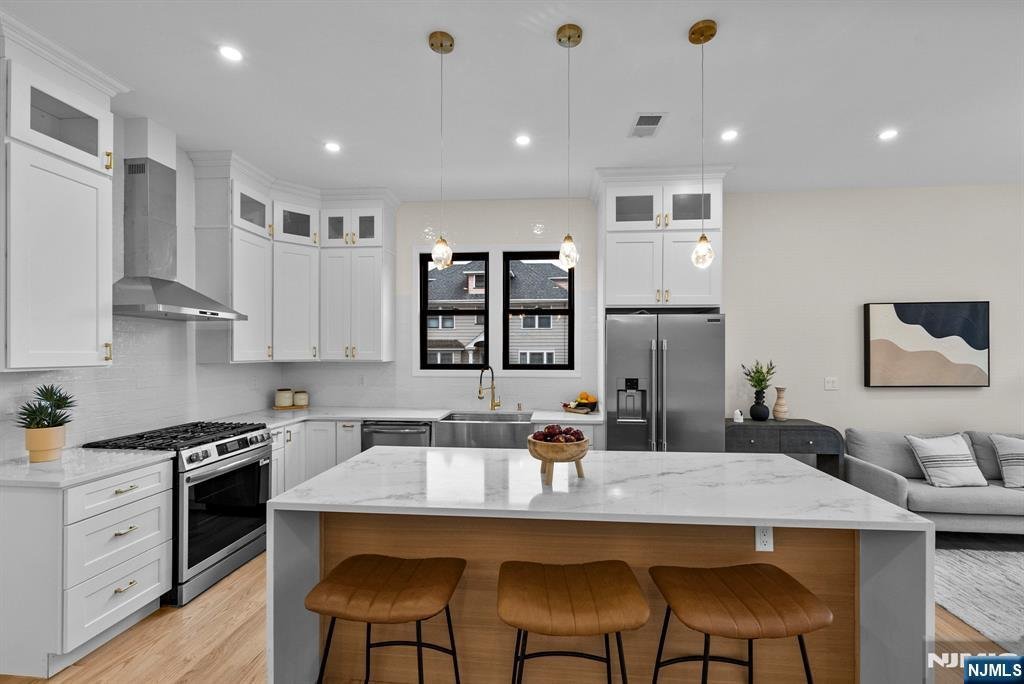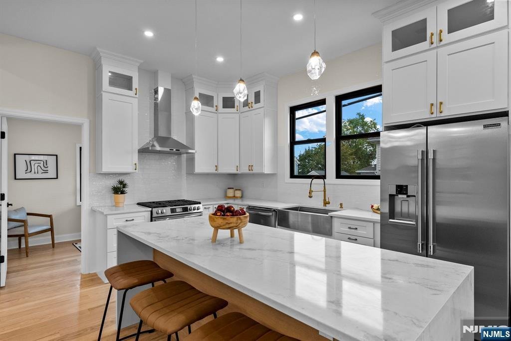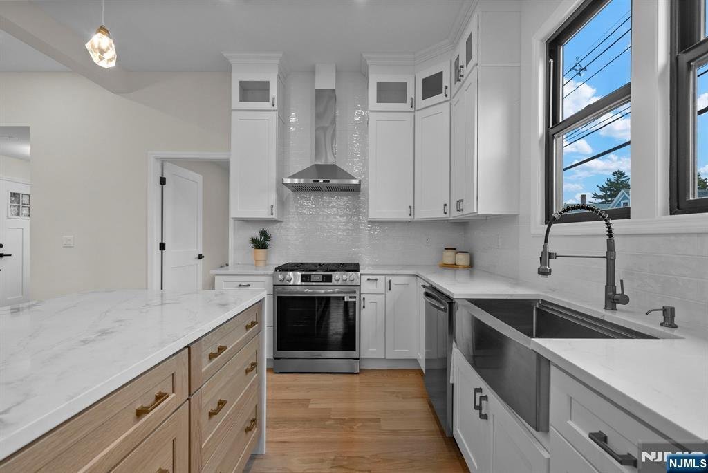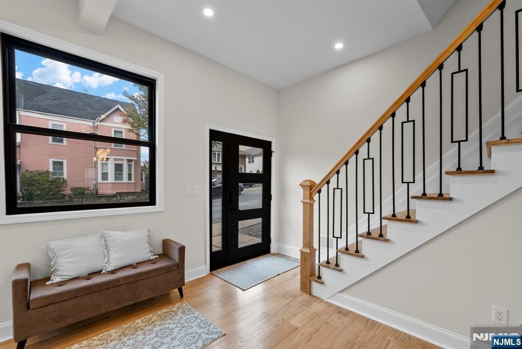 Welcome to 573 Anderson Avenue, Wood-Ridge, where modern design meets skyline views of New York City. This fully rebuilt 5-bedroom, 3.5-bath residence perfectly blends luxury, light, and livability. The open-concept main level invites you in with an elegant flow between the living, dining, and kitchen areas, framed by oversized Andersen windows that flood the home with natural light. At its center, a striking 8-foot island anchors the chefââ¬â¢s kitchen, featuring a full-height designer backsplash, quartz counters, and premium stainless appliances - the ideal space for both gatherings and everyday living. A dedicated office on the main floor adds comfort and function. The second floor offers three spacious bedrooms, including a serene primary suite with a spa-inspired bath and walk-in closet. A second full bathroom completes this level with sophisticated tilework and stone finishes. The third floor expands the home with two additional bedrooms and another full bath, both enhanced by skylights and sweeping views of the Manhattan skyline. Downstairs, the finished basement provides a flexible area ideal for a gym, play room, or media room. Outside, enjoy the private corner lot with an above-ground pool, detached garage, and parking for four.